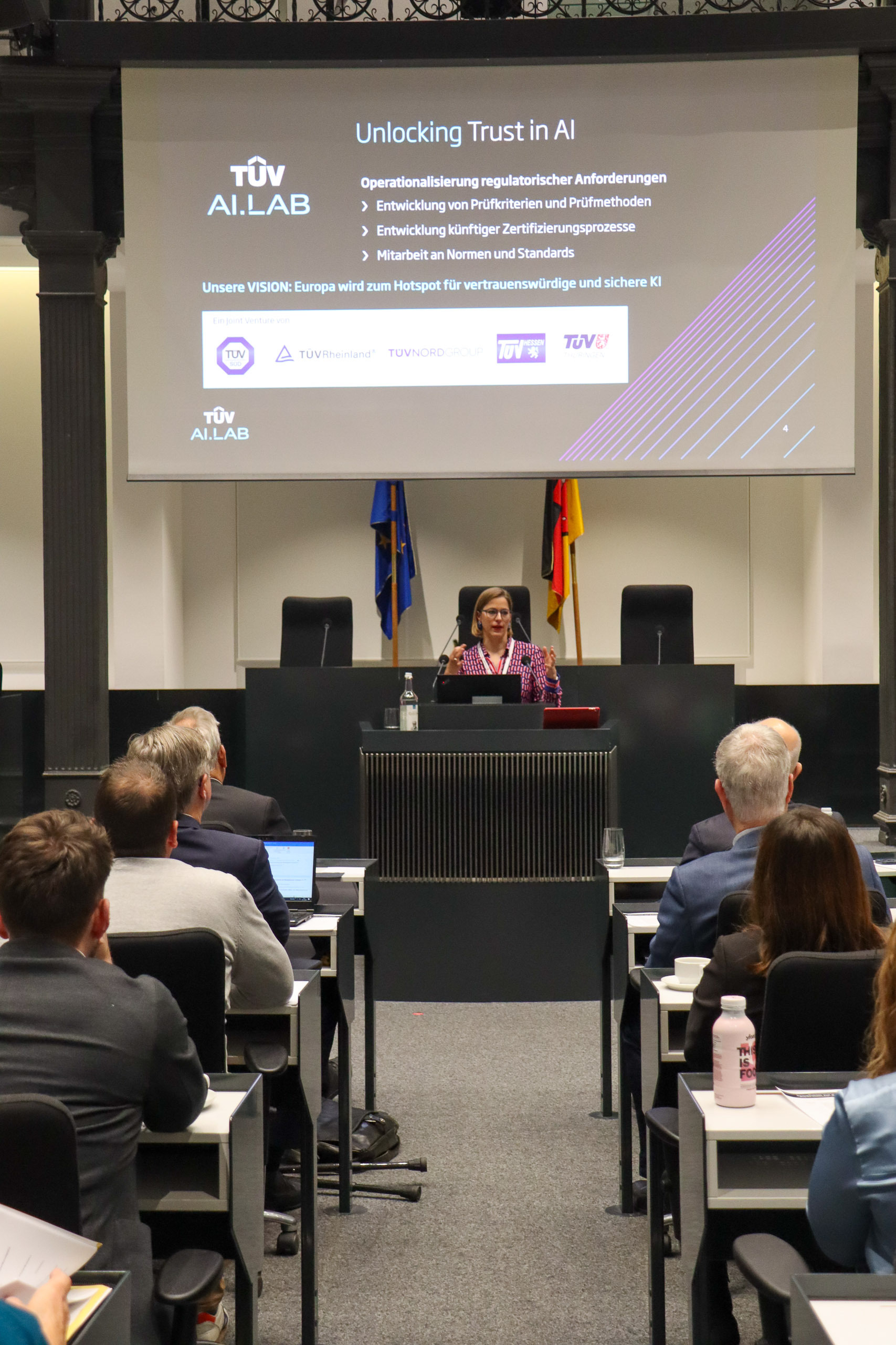 Weitere Vorträge von Professor Dr. Ricardo Usbeck (Leuphana Universität Lüneburg), Franziska Weindauer (Geschäftsführerin TÜV AI.LAB), Professor Dr. Dieter Kugelmann (Landesbeauftragter für den Datenschutz und die Informationsfreiheit in Rheinland-Pfalz) und Jutta Löwe (Head of Regions Compliance bei der Continental Reifen Deutschland GmbH) setzten sich mit rechtlichen und technischen Fragen rund um den Einsatz Künstlicher Intelligenz in Wirtschaft und Verwaltung auseinander, aber auch mit der praktischen Umsetzung. Die Frage der Notwendigkeit spezifischer Rechtsgrundlagen zog sich wie ein roter Faden durch die Veranstaltung und Vorträge, was den Bedarf an klaren Rahmenbedingungen für den Einsatz von Künstlicher Intelligenz deutlich machte.